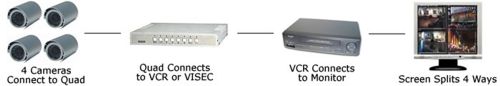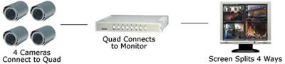 A quad is an accessory to your surveillance system that splits a video monitor into 4 screens. Without a quad you would only be able view one camera at a time. A quad is only needed when you are using more than one camera and using a VCR or VISEC to record or when you are only monitoring and not recording at all. Below are two examples of how a quad works: